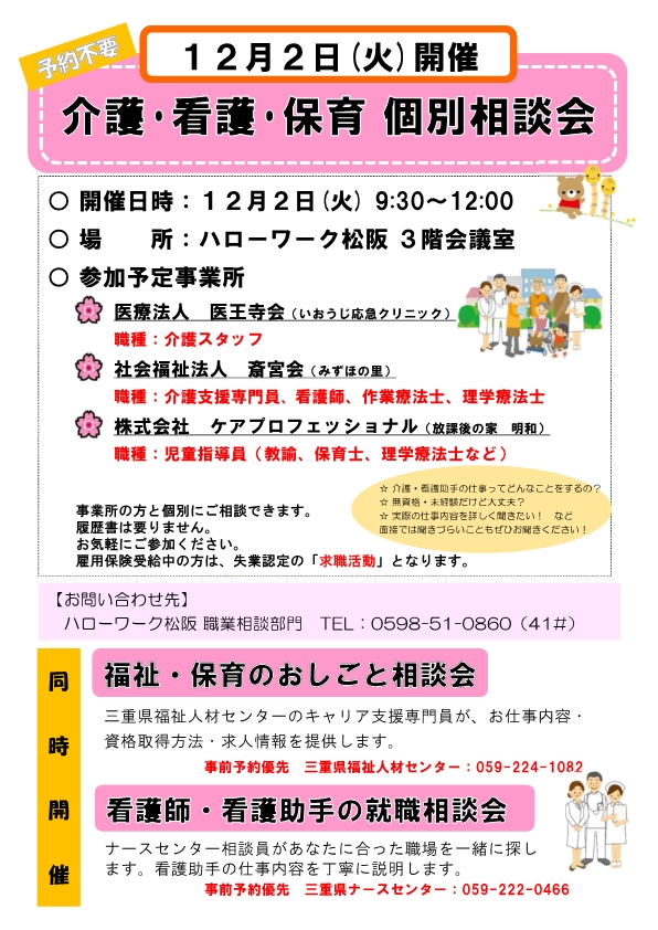12月2日 介護・看護・保育 個別相談会 開催! 予約不要です!
