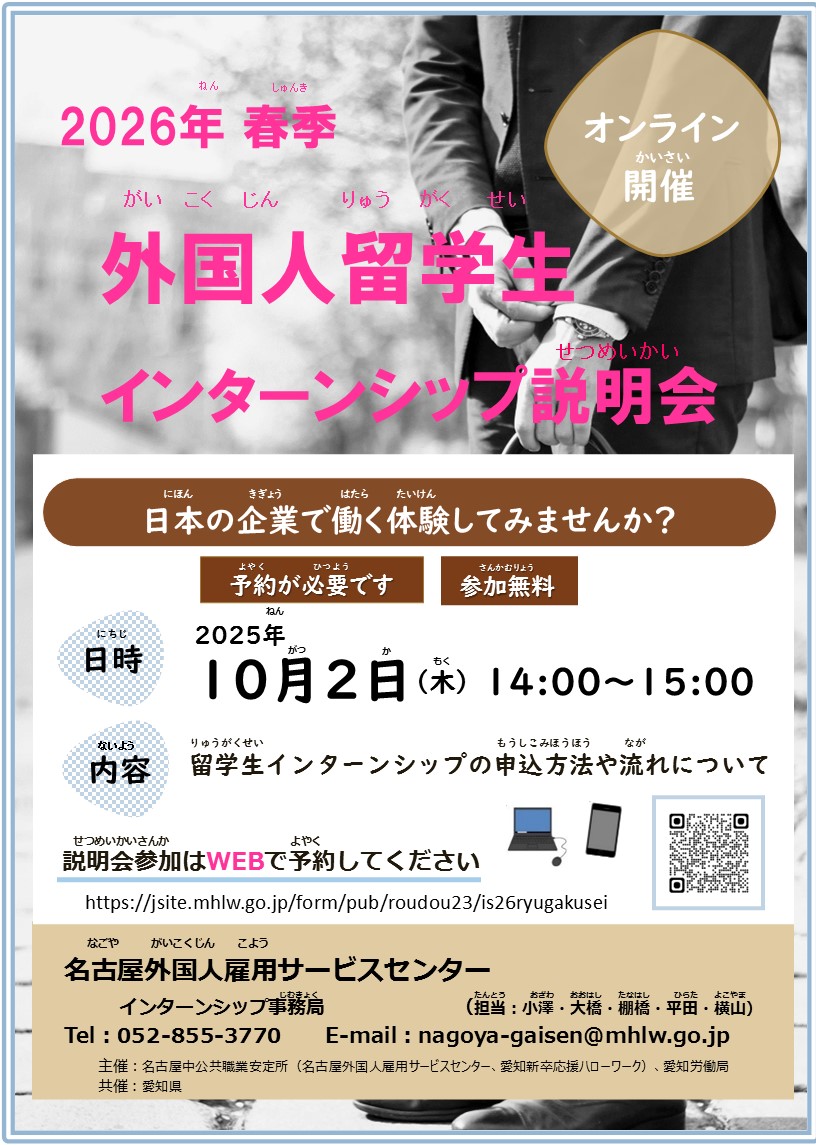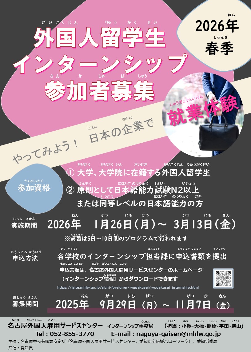 名古屋外国人雇用サービスセンターでは、大学・大学院に在籍する外国人留学生向けのインターンシップ事業を実施します。