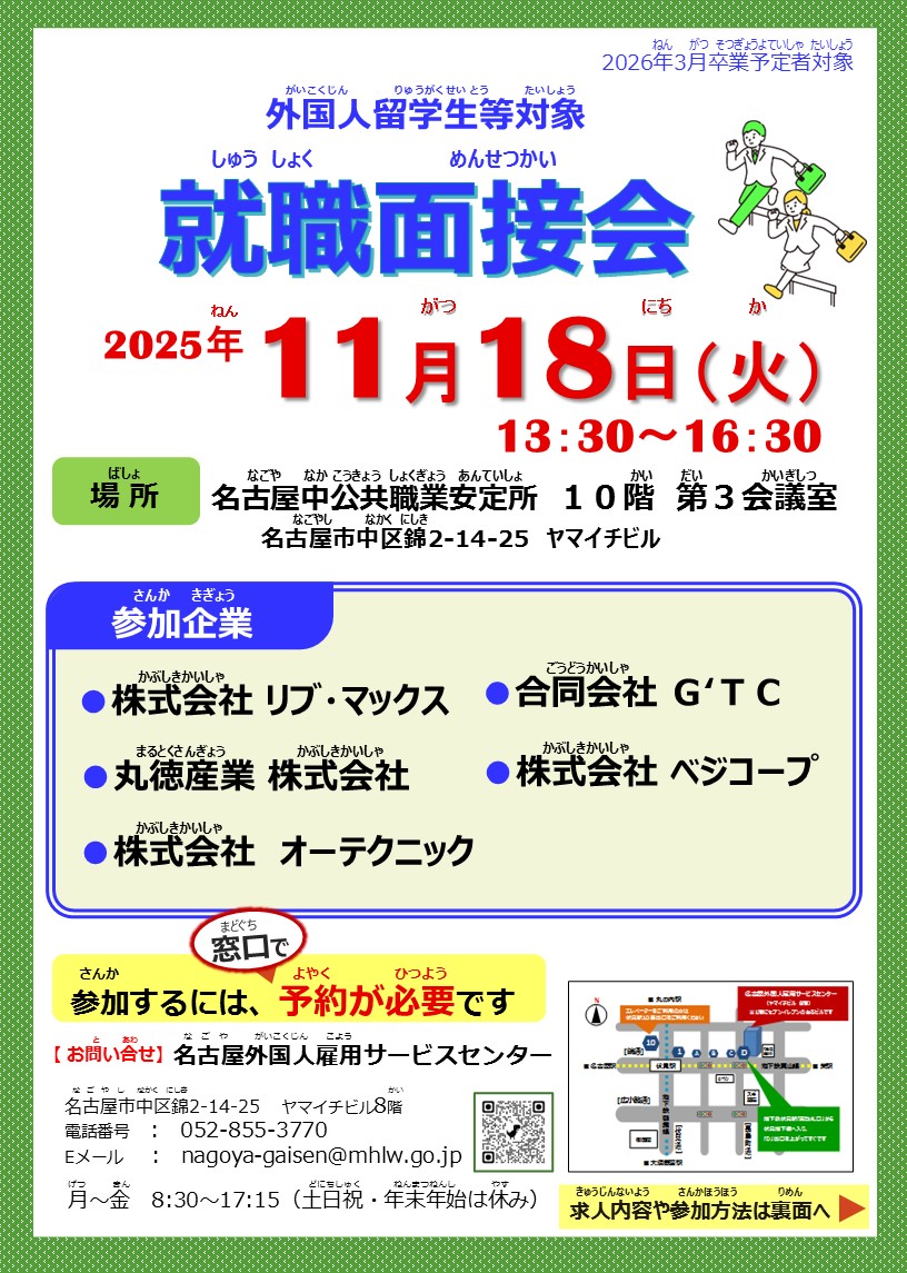 11月18日「外国人留学生等対象 就職面接会」を開催します