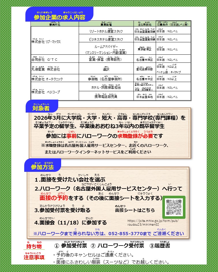 ご不明な点は下記「募集要項」をご確認のうえ、名古屋外国人雇用サービスセンターまでお気軽にご連絡ください。