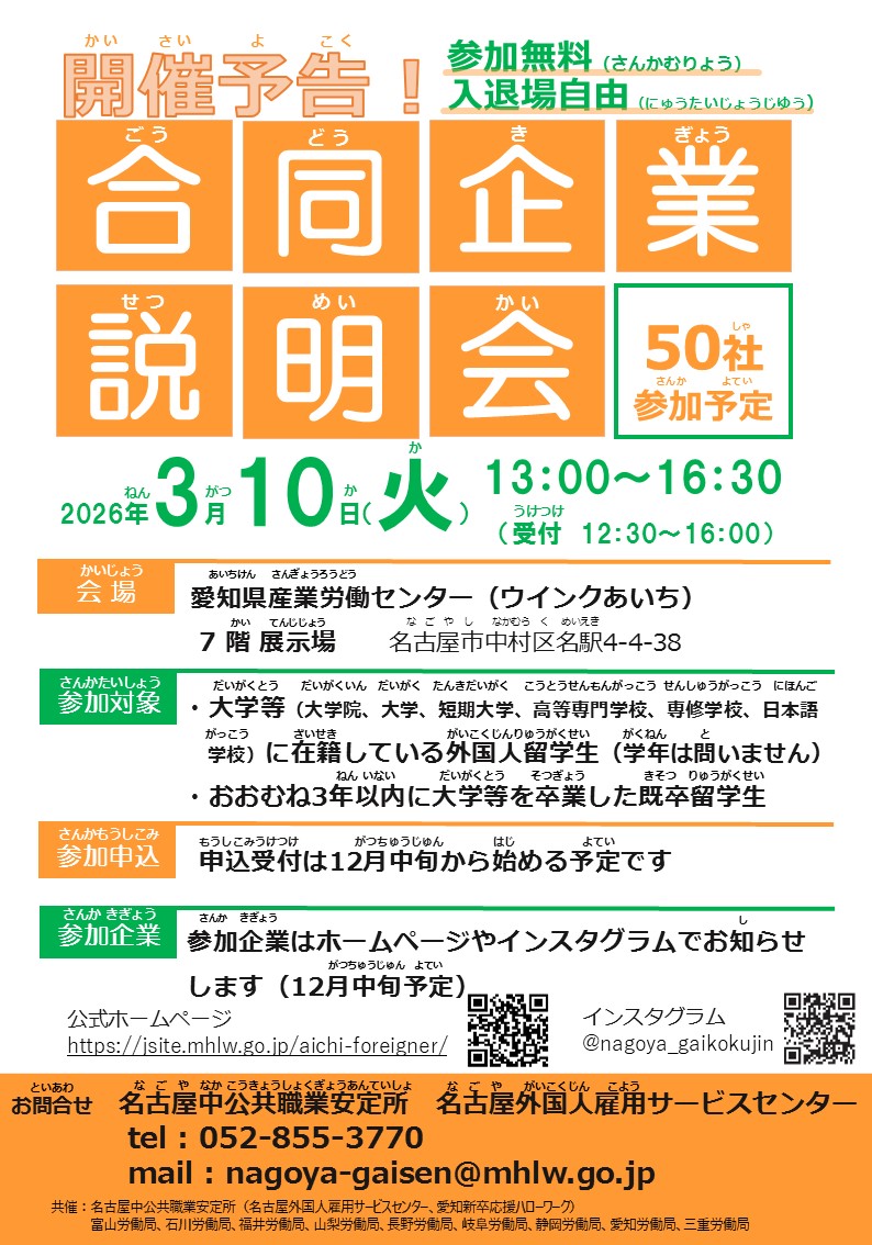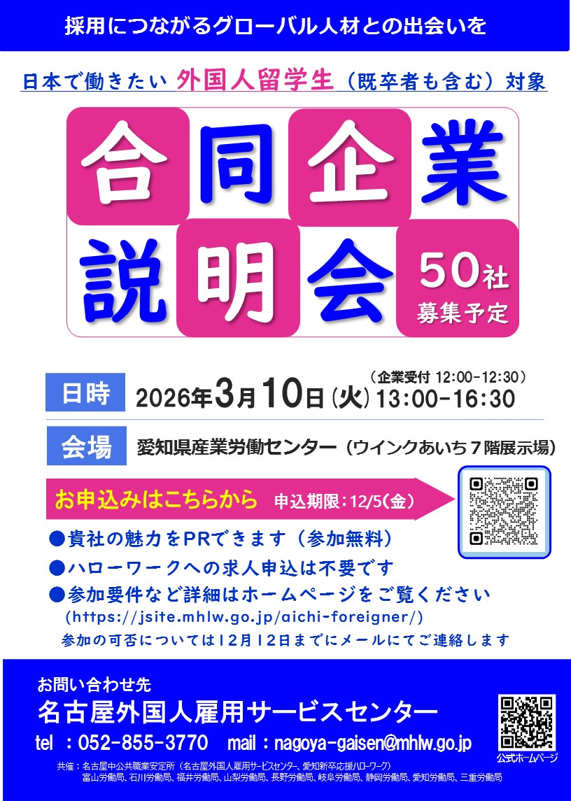 2026年3月に、外国人留学生等を対象とした合同企業説明会を開催します。