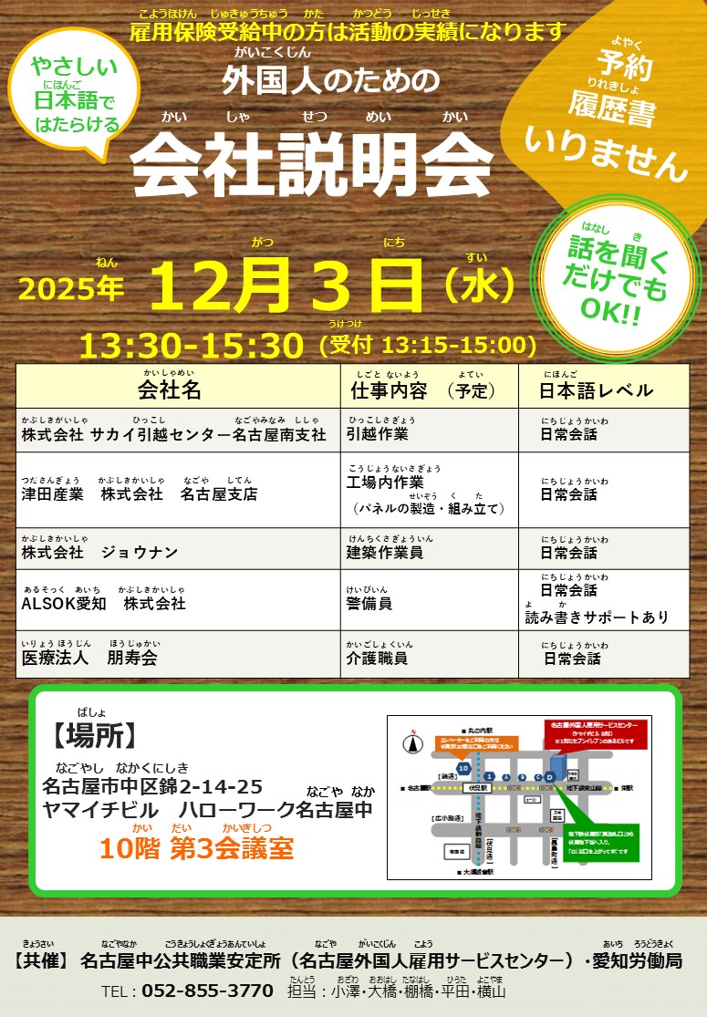 予約もいりません。参加したい方は当日、ハローワーク名古屋中10階にお越しください。