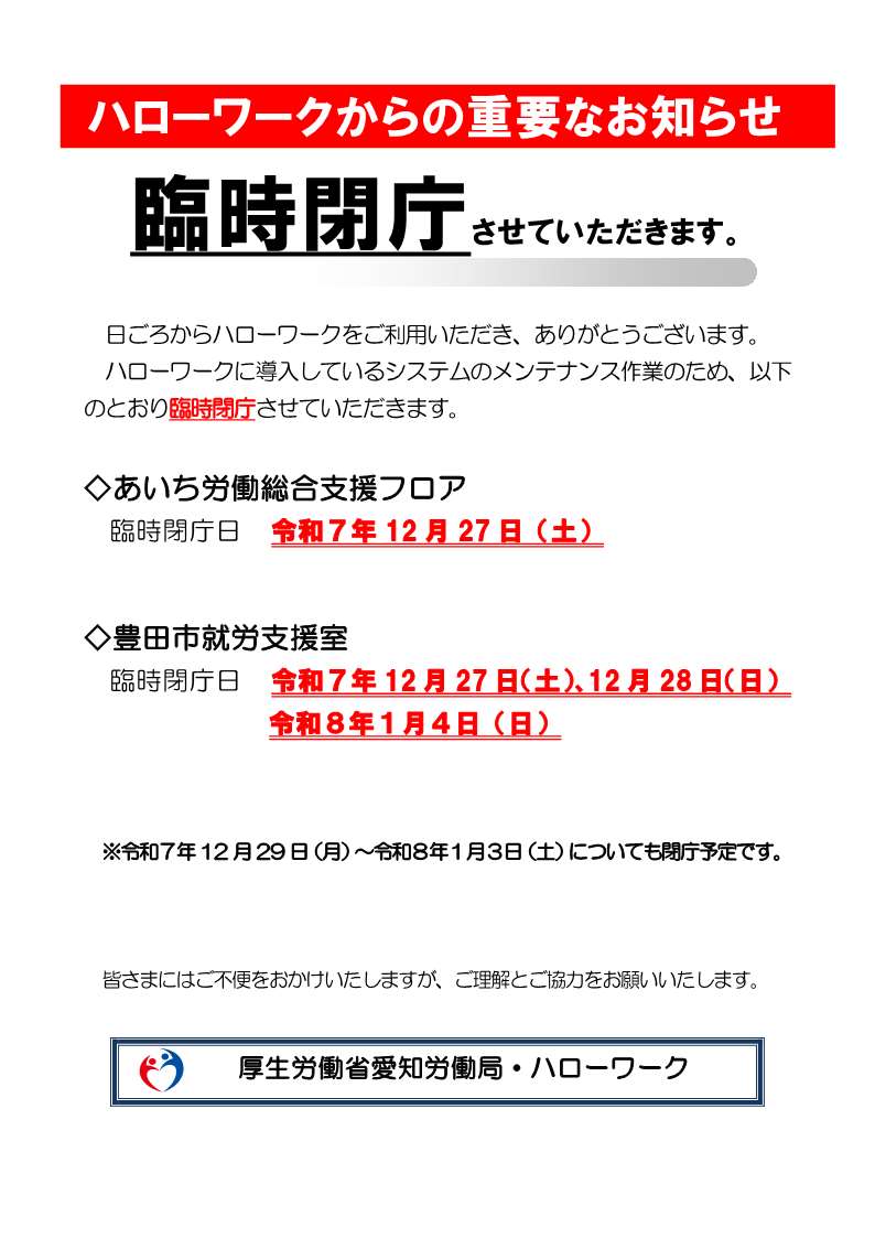 愛知県内ハローワーク関連施設臨時閉庁のお知らせ