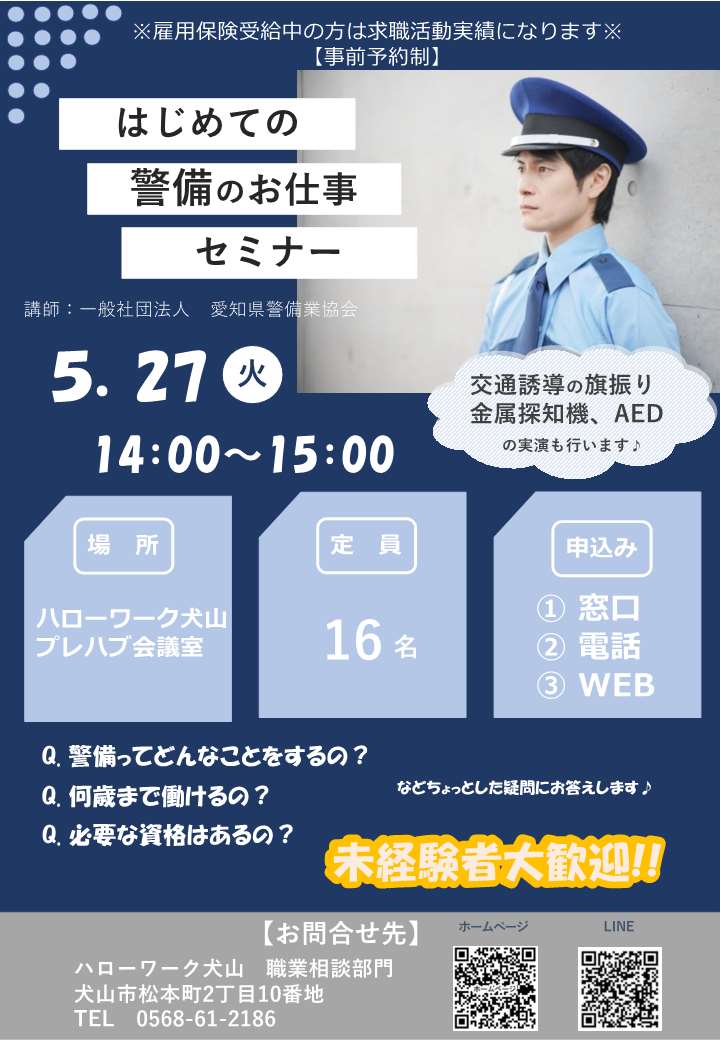 このたび、ハローワーク犬山において「はじめての警備のお仕事セミナー」を開催することとなりました。警備業界の魅力などについて聴くことができる絶好の機会です。