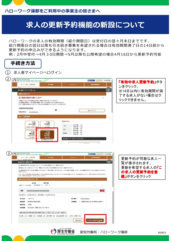 紹介期限日の翌日以降も引き続き募集を希望される場合は、有効期間満了日の14日前から更新予約の申込みができるようになりました。