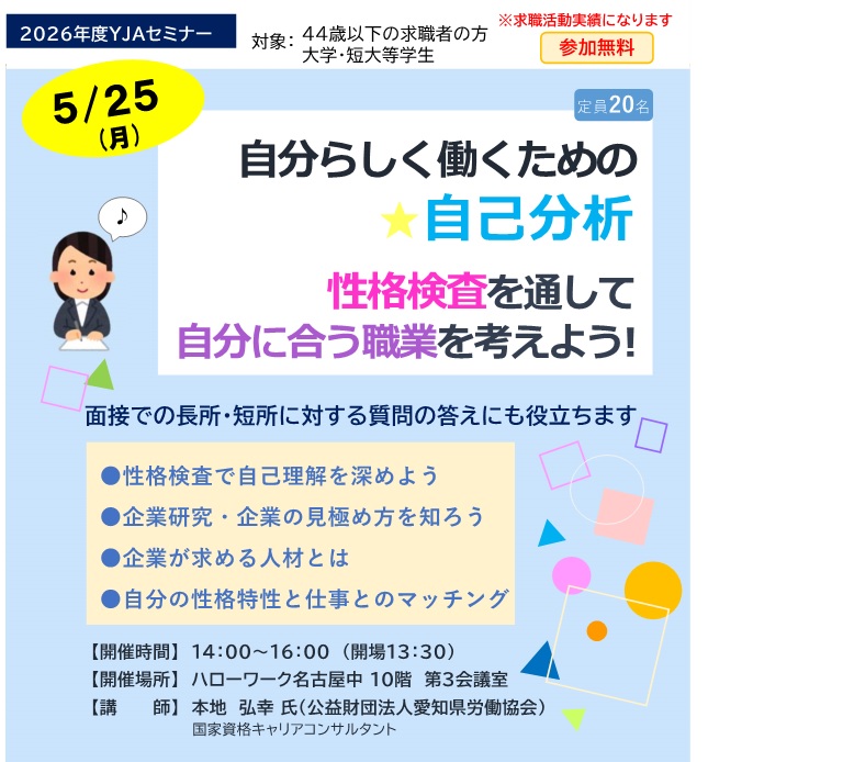 お申込み・お問い合わせは、あいち若者職業支援センター☎052-232-2351 まで!