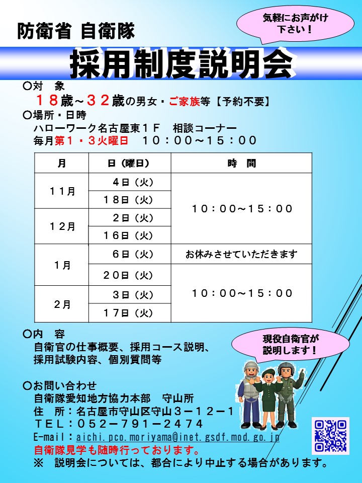 毎月の第1・3火曜日10~15時に採用にかかる説明会を実施しています。予約は不要です。【対象】18~32歳で仕事をお探しの方(ご家族も含む)