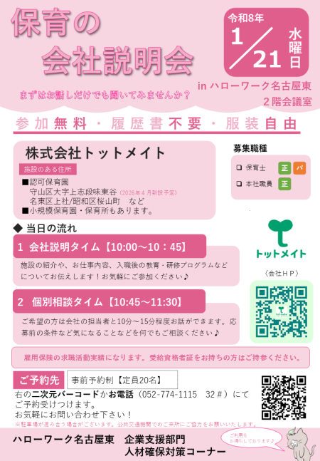 ハローワーク名古屋東の窓口、電話、WEBのいずれかでお申し込みください。参加事業所の情報