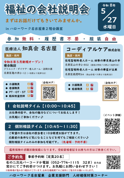 ハローワーク名古屋東の『窓口』『電話』『WEB』でお申し込みください。参加事業所の情報