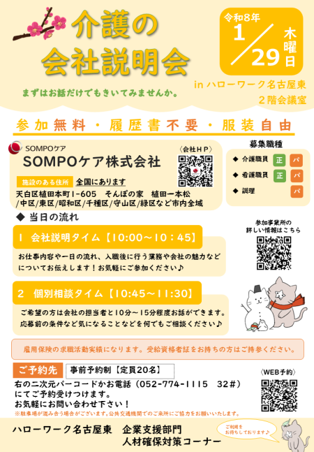 ハローワーク名古屋東の窓口、電話、WEBのいずれかでお申し込みください。参加事業所の情報