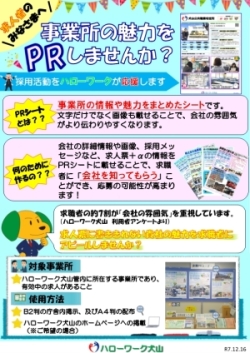 ハローワーク犬山では、求人への応募の可能性を高めるため、求人者のみなさまが作成した「事業所PRシート」をハローワーク犬山庁舎内掲示、及び求職者への配布を行うサービスを開始します。