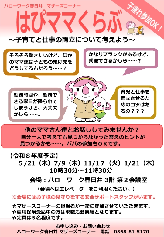 子育てと仕事の両立について考えるセミナーです。他のママさん達とお話ししてみませんか?1人で考えても見つからなかった答えのヒントが見つかるかもしれません。パパの参加もOKです。