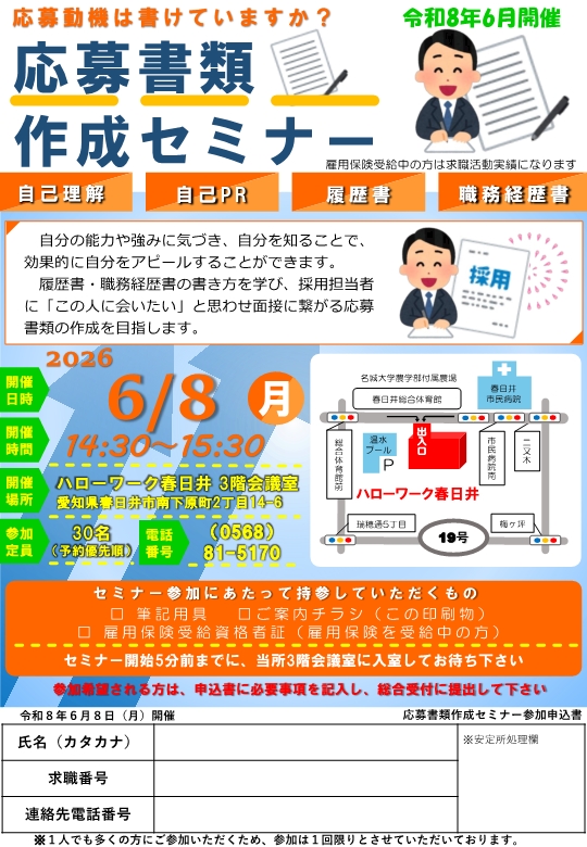 筆記用具、ご案内チラシ、雇用保険受給資格者証(雇用保険を受給中の方)