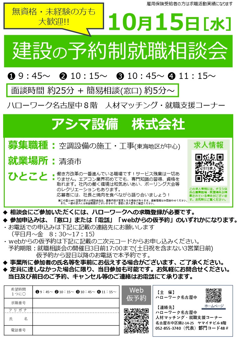 10月15日(水) 予約制就職相談会 【建設】