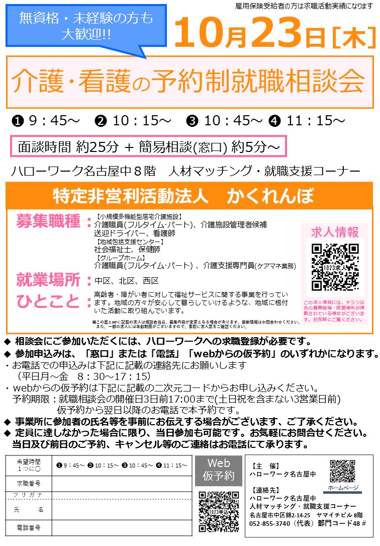 10月23日(木) 予約制就職相談会 【介護・看護】