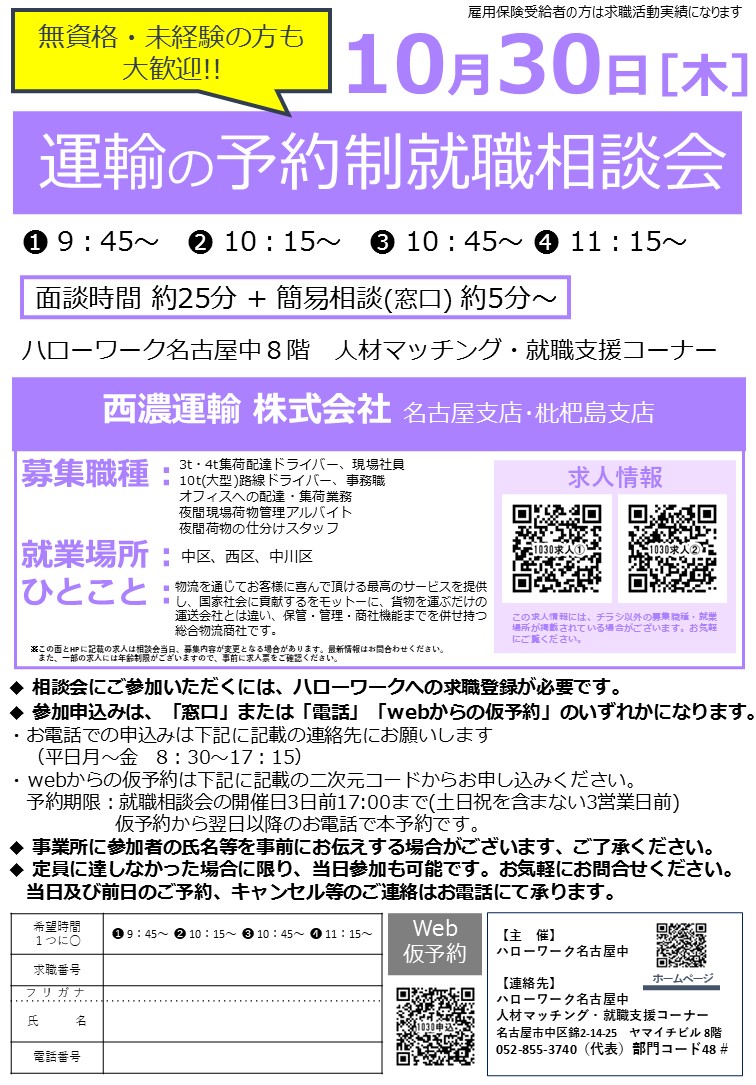 10月30日(木) 予約制就職相談会 【運輸】