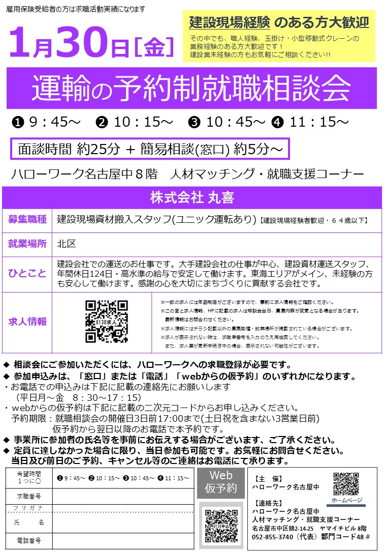 1月30日(金) 予約制就職相談会 【運輸】