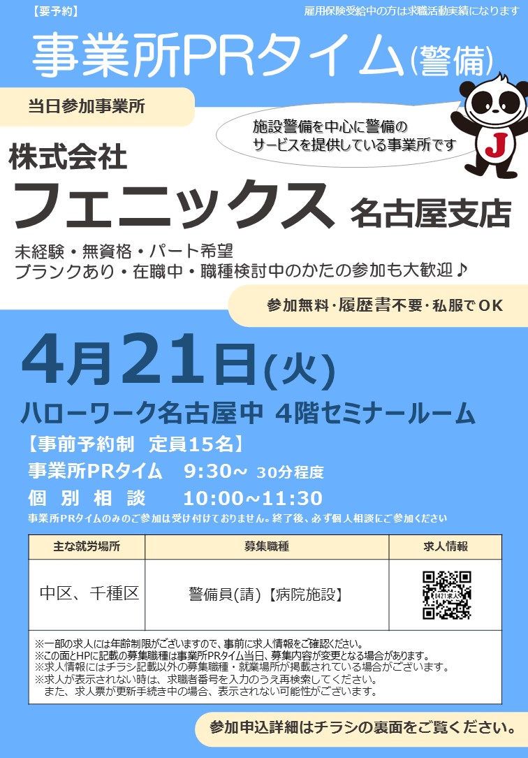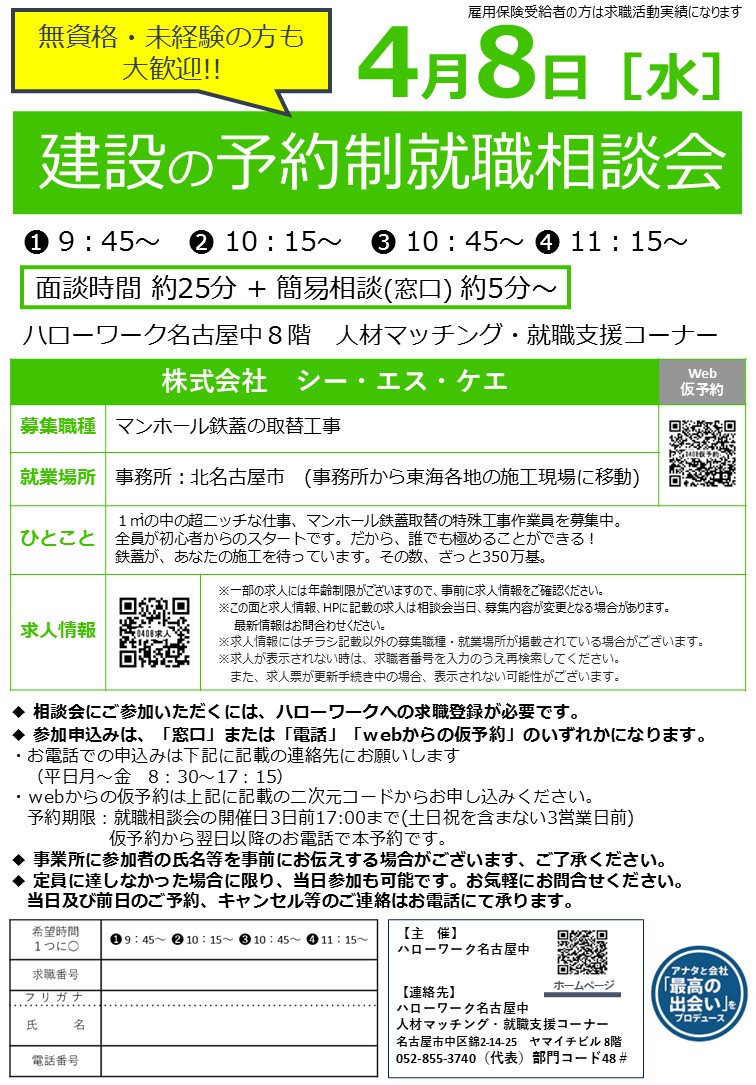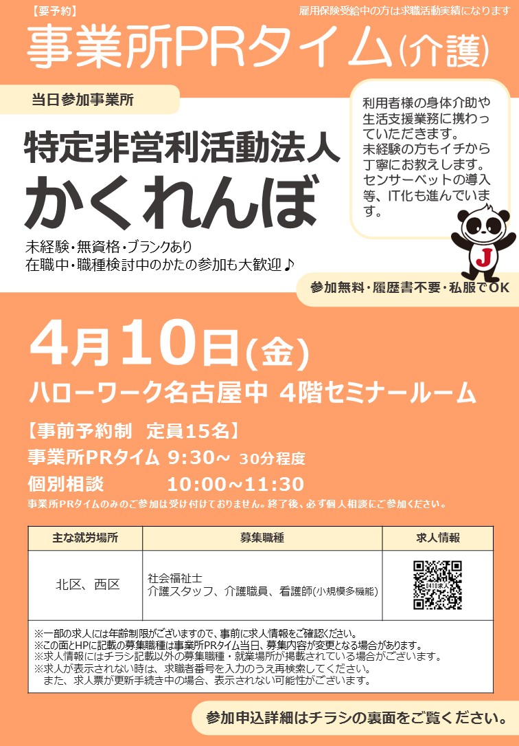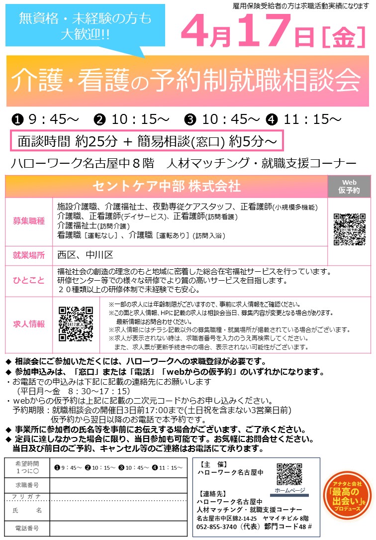 4月17日(金) 予約制就職相談会 【介護・看護】