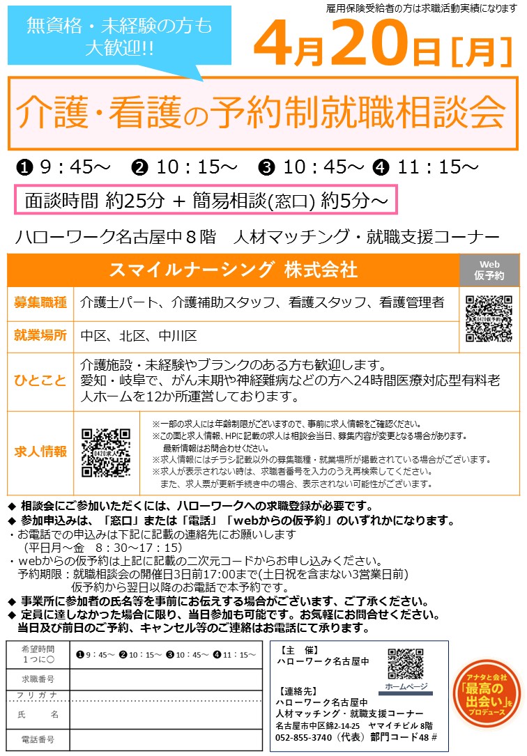 4月20日(月) 予約制就職相談会 【介護・看護】