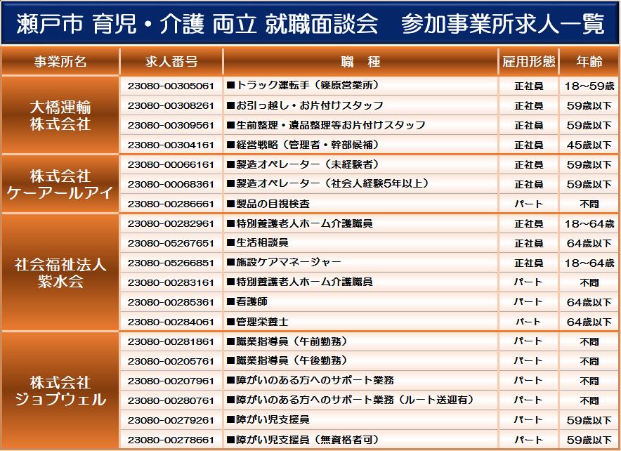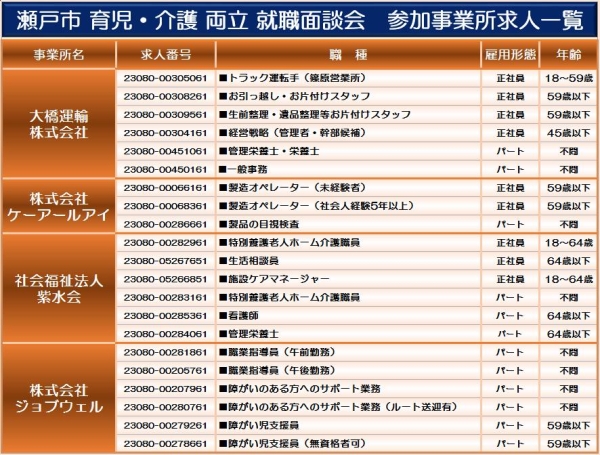 瀬戸市内企業4社(予定)が参加する『瀬戸市 育児・介護両立 就職面談会』を開催します。