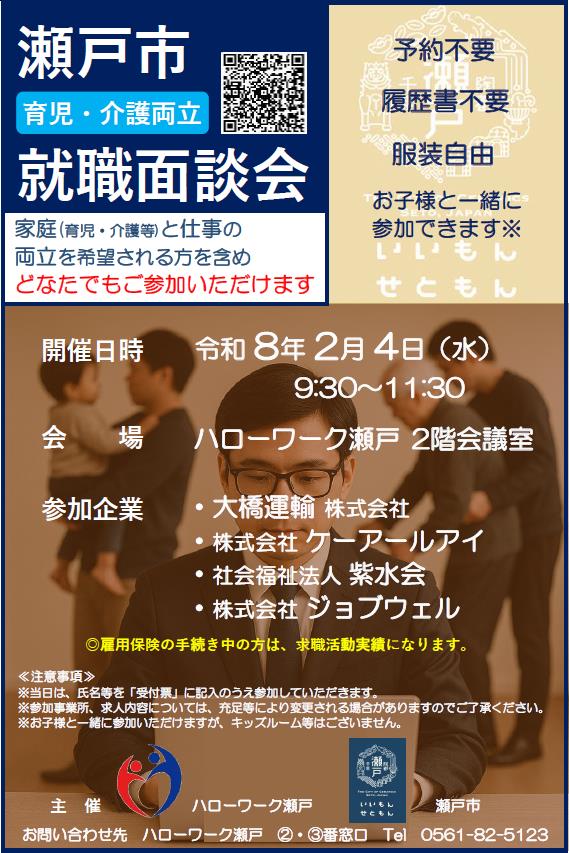 『瀬戸市 育児・介護両立 就職面談会』を 令和8年2月4日(水)に開催します