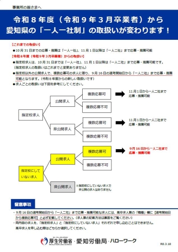 ●令和8年度(令和9年3月卒業者)から愛知県の「一人一社制」の取扱いが変わります!