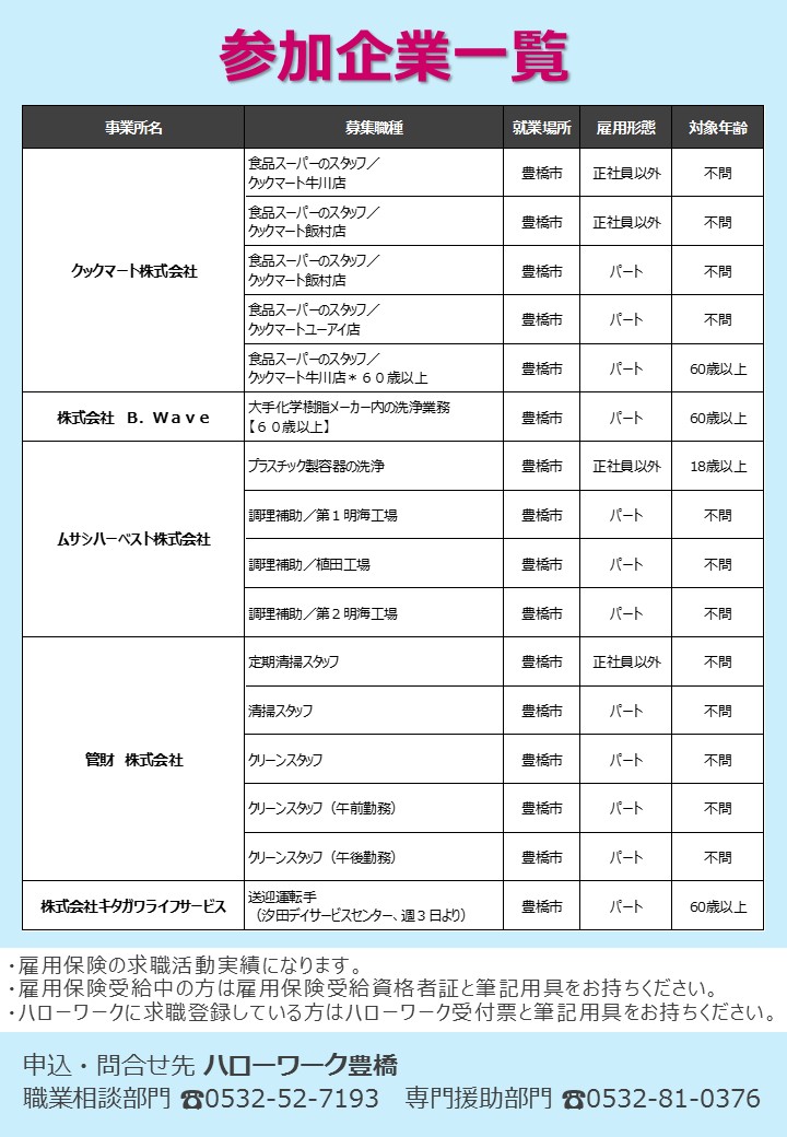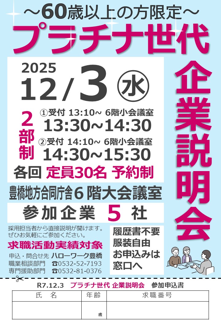 60歳以上の方を対象とした企業説明会を開催します。 【2部制・予約制】です。 各窓口でお申し込みください。 ~リーフレット~