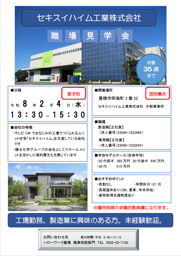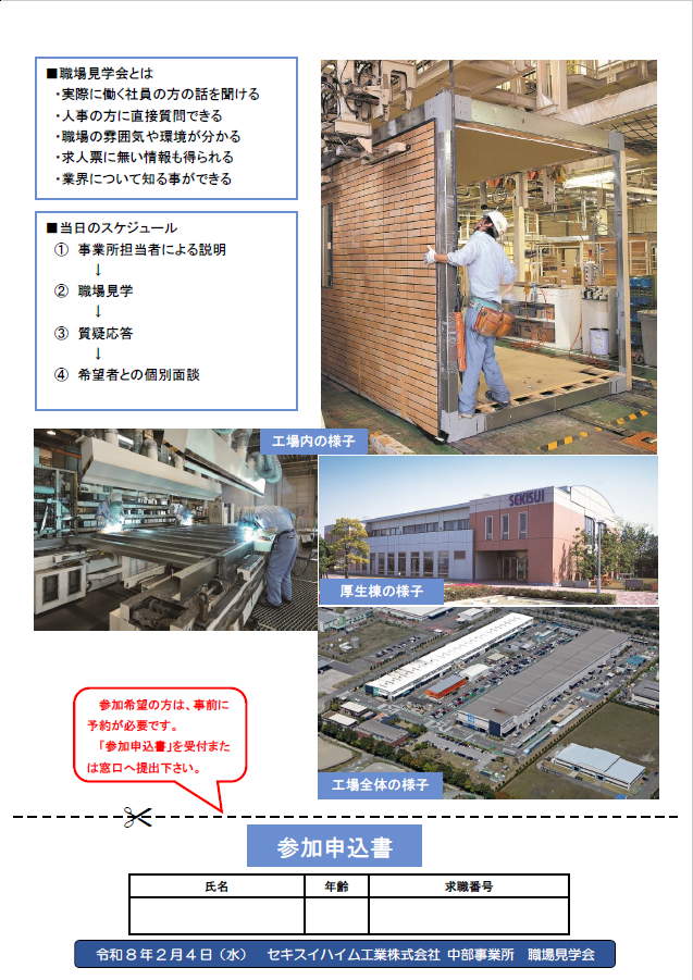 セキスイハイム工業株式会社 中部事業所の職場見学会を実施いたします!