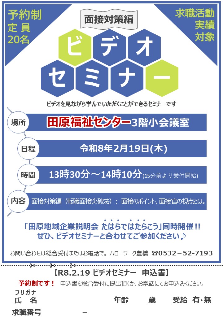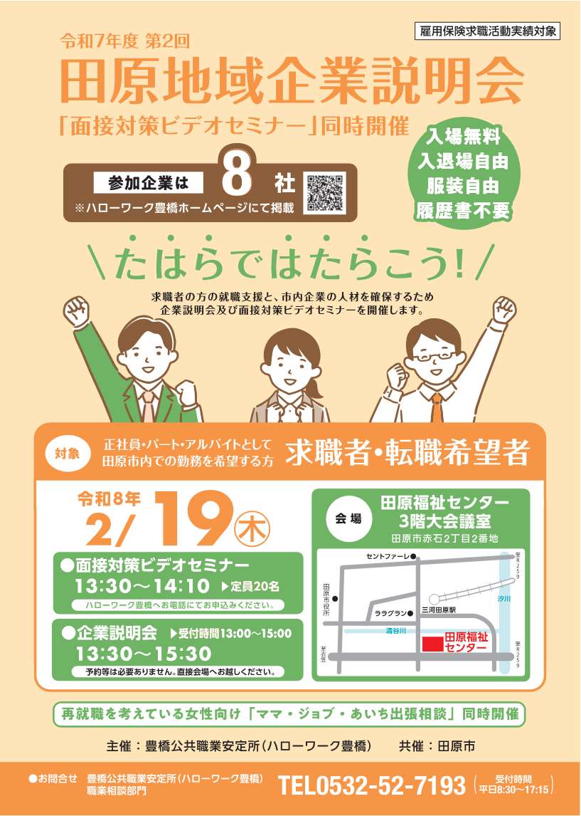 勤務地が田原市の企業8社が参加する企業説明会を開催します。 ビデオセミナー同時開催! 企業説明会は入退場自由、ビデオセミナーは予約制(定員20名)です。ぜひご参加ください。 ~YouTube動画~ ~リーフレット~
