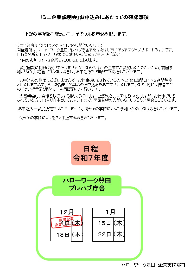 ★「管内ミニ企業説明会」のご案内です。詳細は「確認事項・日程表」をご覧ください。 ★参加を希望される場合は「参加申込書」をご提出願います。 確認事項・日程表 参加申込書