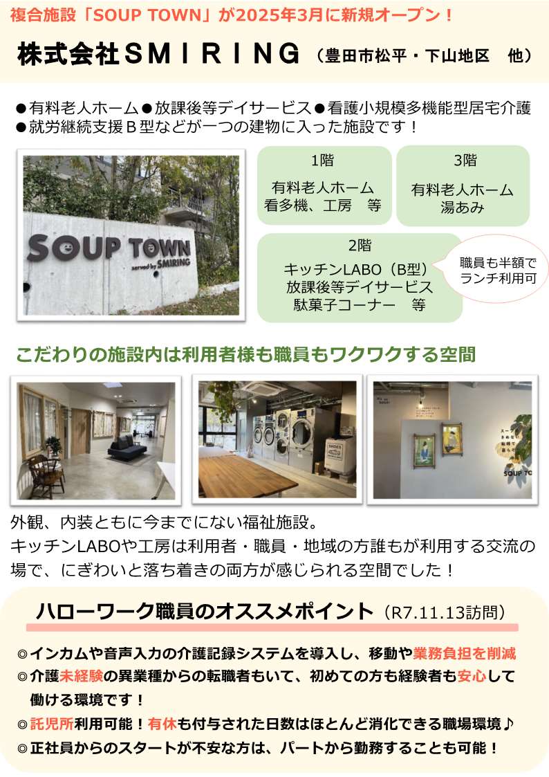 | ■ 事業内容:JA出資による社会福祉法人です。居宅介護支援、通所介護、訪問介護、在宅介護支援、特別養護老人ホームを運営しています。 ■ 就業場所:豊田市中根町・豊田市堤町・豊田市若林西町・豊田市井上町 ■ 求人情報を表示する ■ ホームページ |