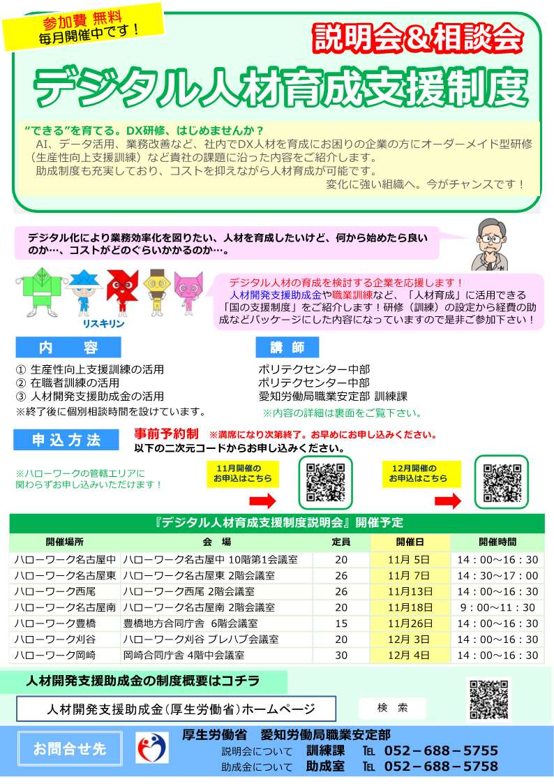 ハローワーク名古屋中は、11月5日(水)14:00~16:30に10階第1会議室でデジタル人材育成支援制度説明会&相談会を開催します。 AI、データ活用、業務改善など、社内でDX人材育成にお困りの企業の方にオーダーメイド型研修(生産性向上支援訓練)など貴社の課題に沿った内容をご紹介します。 助成制度も充実しており、コストを抑えながら人材育成が可能です。 変化に強い組織へ。今がチャンスです!