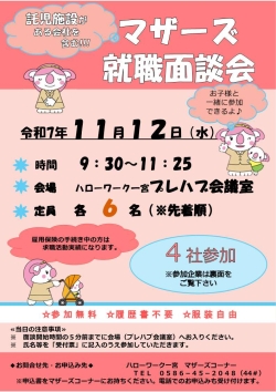 「託児施設がある会社を含む!!!」マザーズ就職面談会のお知らせ