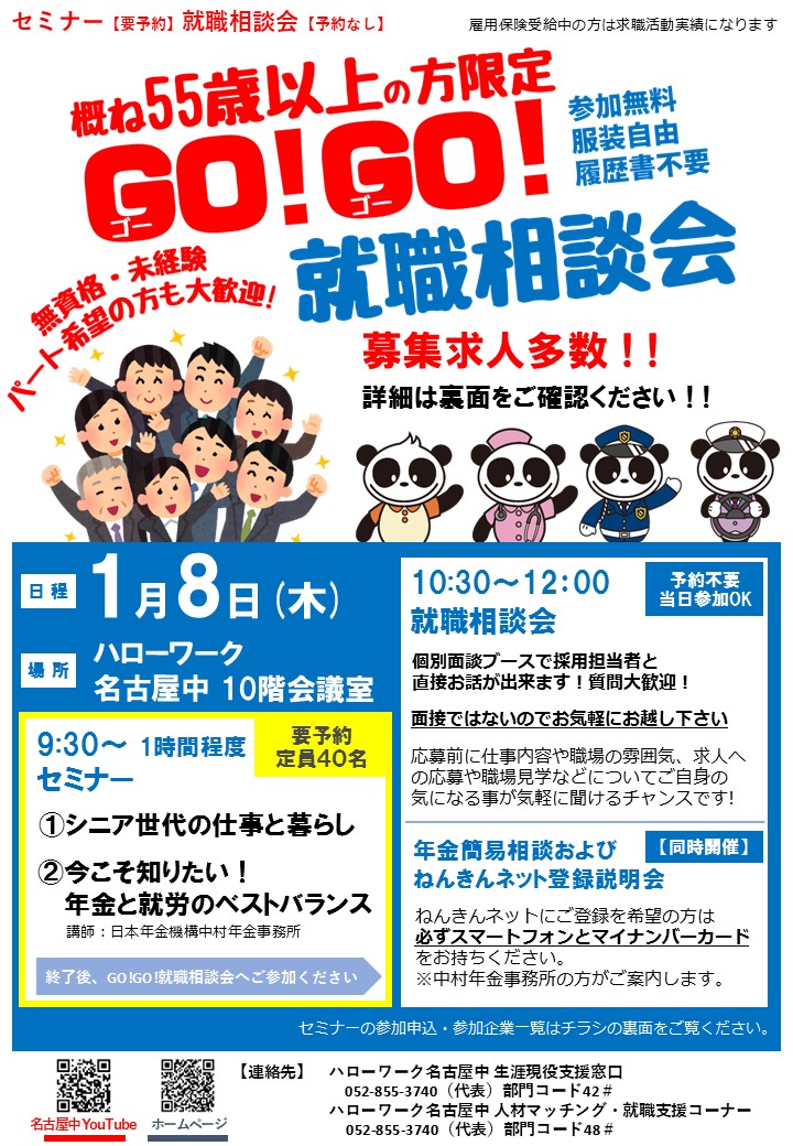 このたび、ハローワーク名古屋中において、55歳以上歓迎求人を中心とした就職相談会を開催します。