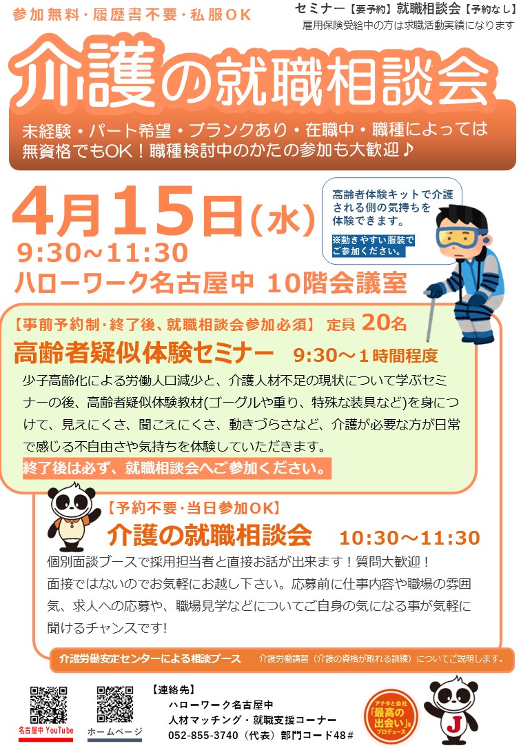 このたび、ハローワーク名古屋中において、介護転職フェアを開催します。