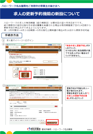 ▶詳しくは↓↓↓リーフレット(「求人の更新予約機能の新設について」)(PDF形式:1095KB)をご覧ください。