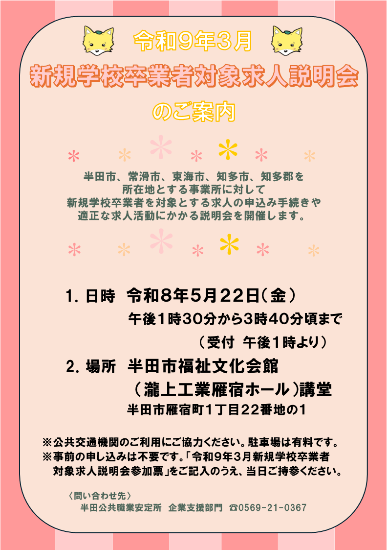半田市、常滑市、東海市、知多市、知多郡を所在地とする事業所に対して新規学校卒業者を対象とする求人の申込み手続きや適正な求人活動にかかる説明会を開催します。