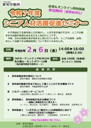愛知労働局では公益社団法人愛知県シルバー人材センター連合会との共催で、企業におけるシニア人材の活躍促進を目的として以下のとおりセミナーを開催します。