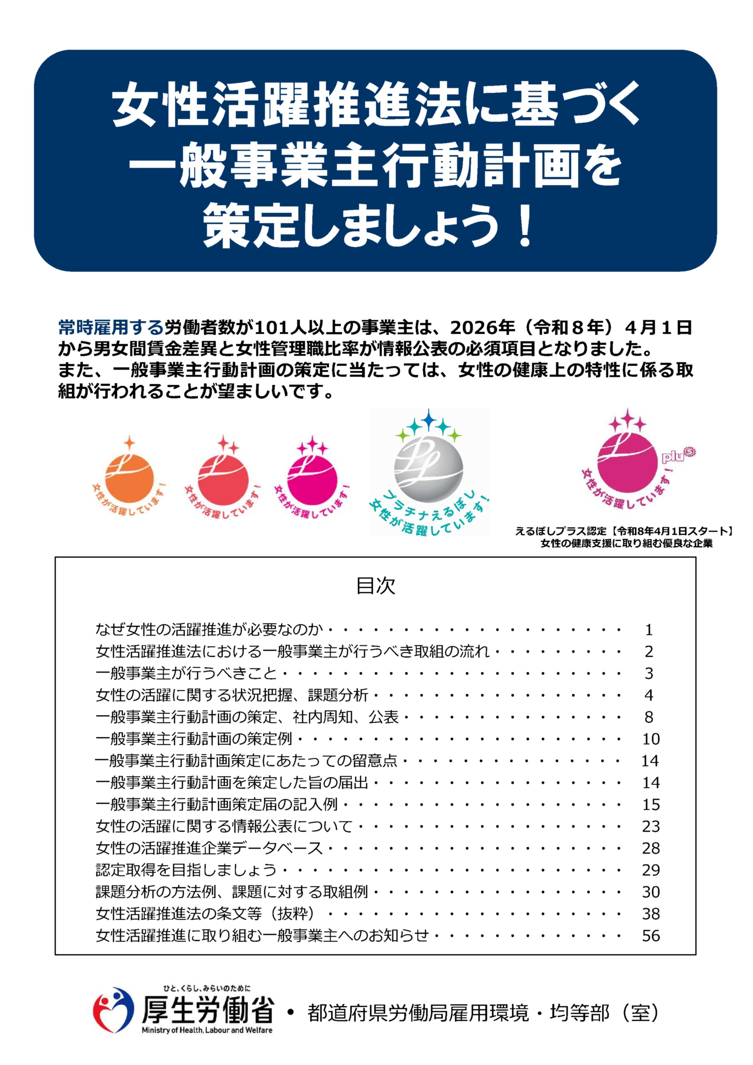 その他詳細は、厚生労働省・女性活躍推進法特集ページをご覧ください。