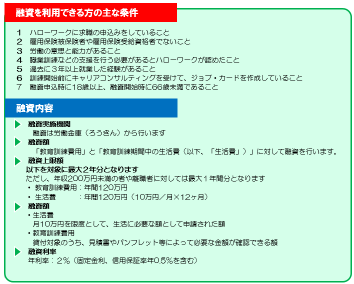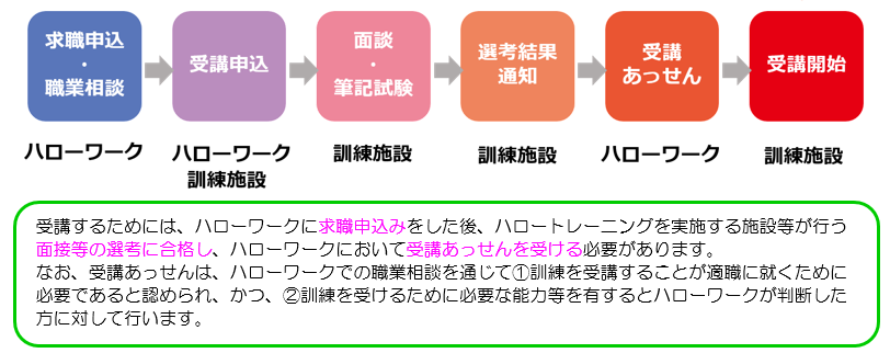 ◇対 象:ハローワークの求職者 主に雇用保険を受給できない方 ◇受講料:無料(テキスト代等除く) ◇訓練期間:2ヶ月~6ヶ月 ◇実施機関:民間教育訓練機関等 (訓練コースごとに厚生労働大臣が認定) |