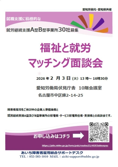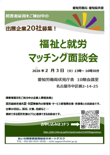 障害福祉サービスである就労継続支援A型・B型事業所管理者と企業担当者との相互理解と連携のため、愛知労働局・愛知県共催により「福祉と就労マッチング面談会」を開催いたします。