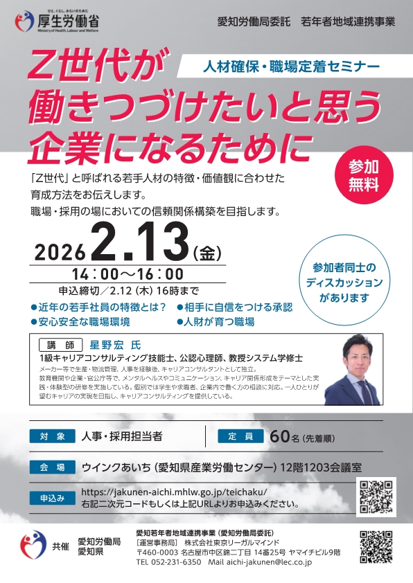 | 2月13日 | 【企業向け】 | 人材確保・職場定着セミナー~Z世代が働き続けたいと思う企業になるため(リーフレットショート動画をUPしました。) |