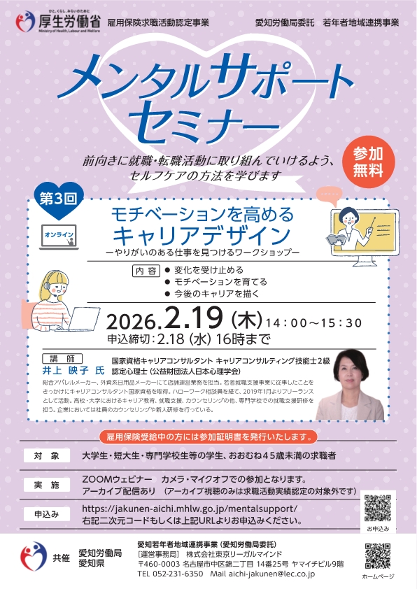 | 2月19日 | 【求職者向け】 | メンタルサポートセミナー~モチベーションを高めるキャリアデザイン(リーフレットショート動画をUPしました。) |