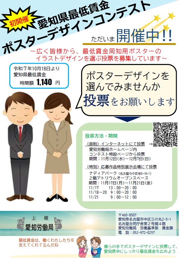 現在、広く皆様から最低賃金周知用ポスターのイラストデザインを選ぶ投票を募集しています。