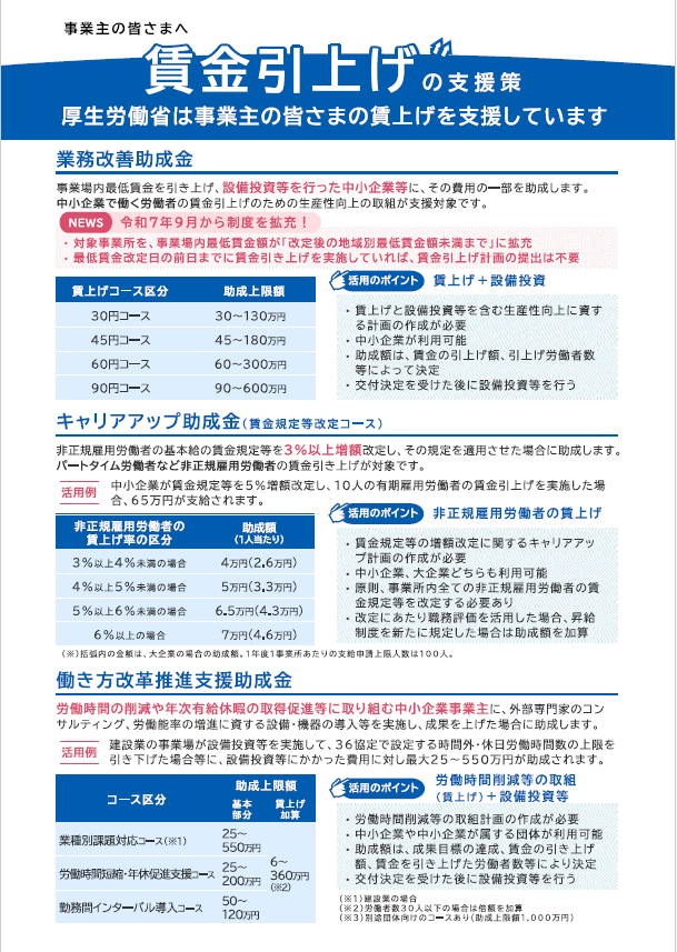 ● 賃金の引上げに向けた支援策として,「賃上げ支援助成金パッケージ」を策定しました。