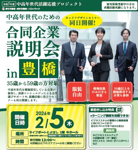 ◆『令和7年度中高年世代活躍応援プロジェクト』(愛知労働局委託事業)による求職者向けセミナーと合同企業説明会が豊橋で開催されます。