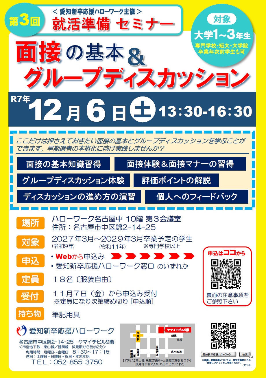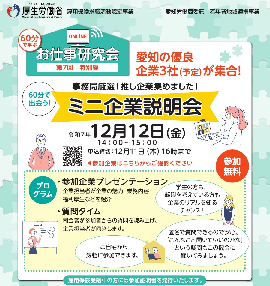 愛知新卒応援ハローワークでは、Weekly伏見キャリアガイダンス(通称「ふしキャリ」)という名称で毎週水曜日に企業の採用担当者と直接話が聞ける企業説明会を開催しています。