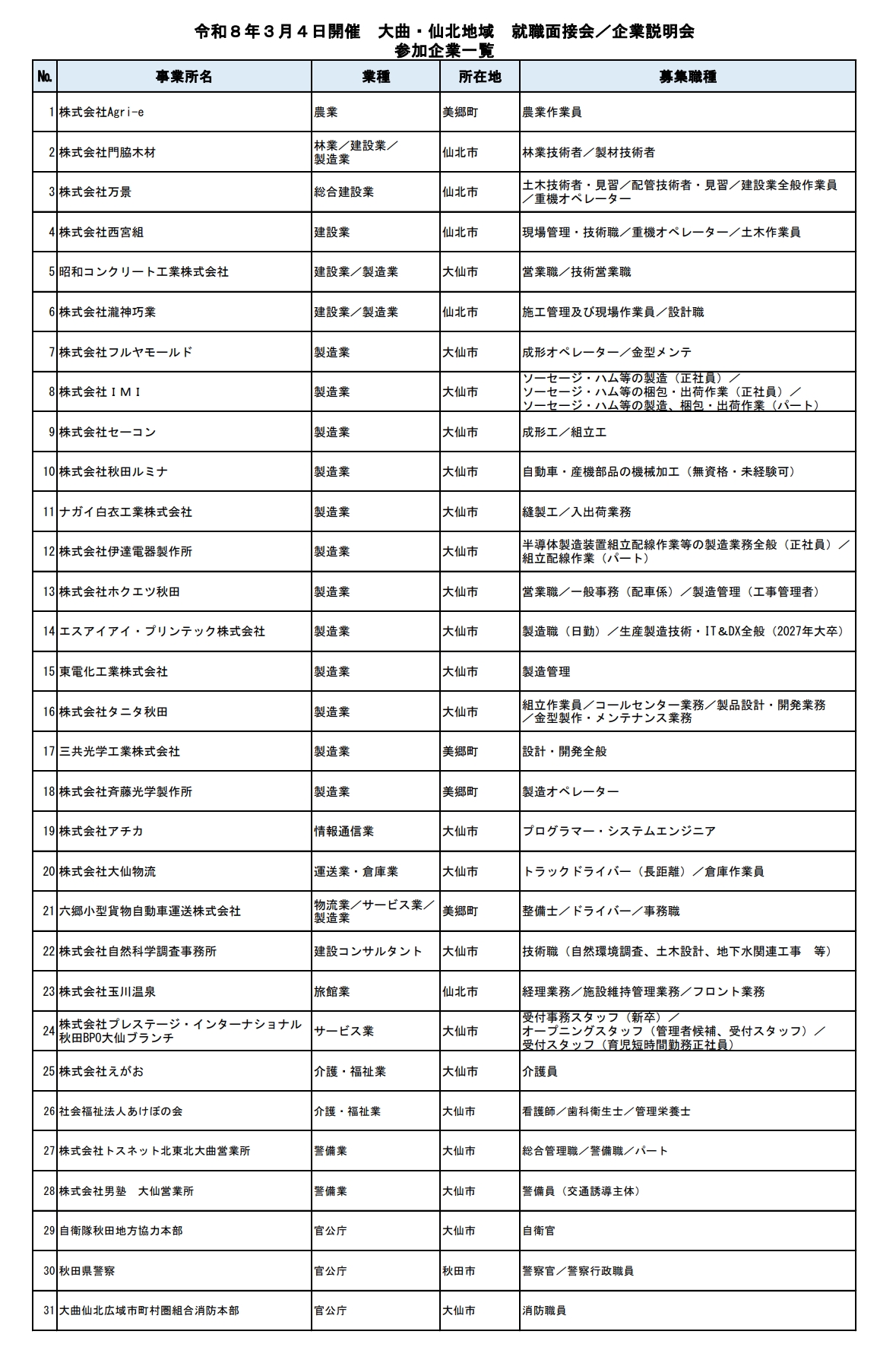 大曲・仙北地域 就職面接会/企業説明会のご案内