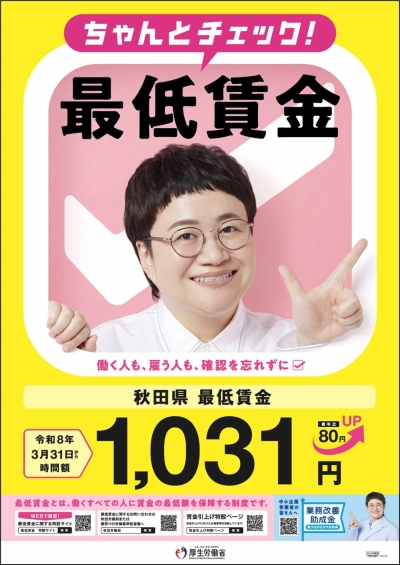 すべての産業及び労働者に適用される「秋田県最低賃金」は、令和8年3月31日から「時間額1,031円」に改定されます。