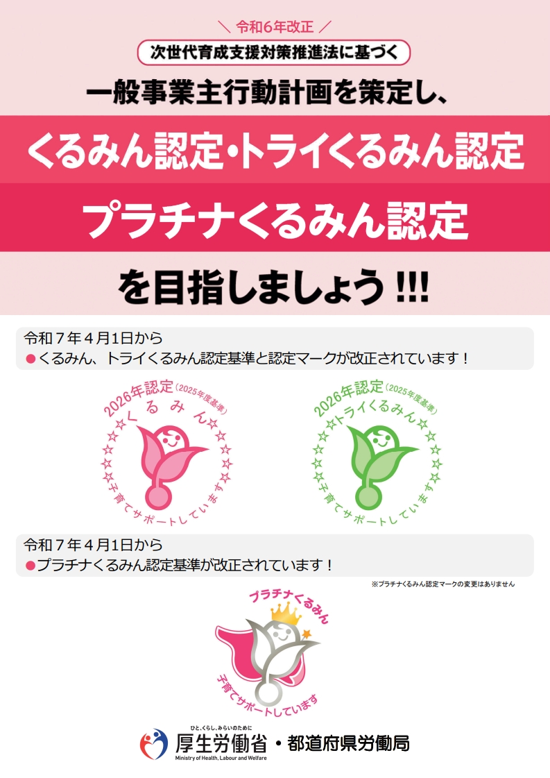 次世代育成支援対策推進法(以下「次世代法」という。)に基づき、一般事業主行動計画を策定・届出し、計画に定めた目標を達成したなど、一定の基準を満たす企業は、申請することにより、労働局長の認定(くるみん認定)を受けることができます。また、くるみん認定企業のうち、より高い水準の取組を行った企業が一定の要件を満たした場合、申請を行うことにより、プラチナくるみん認定を受ける事ができます。
